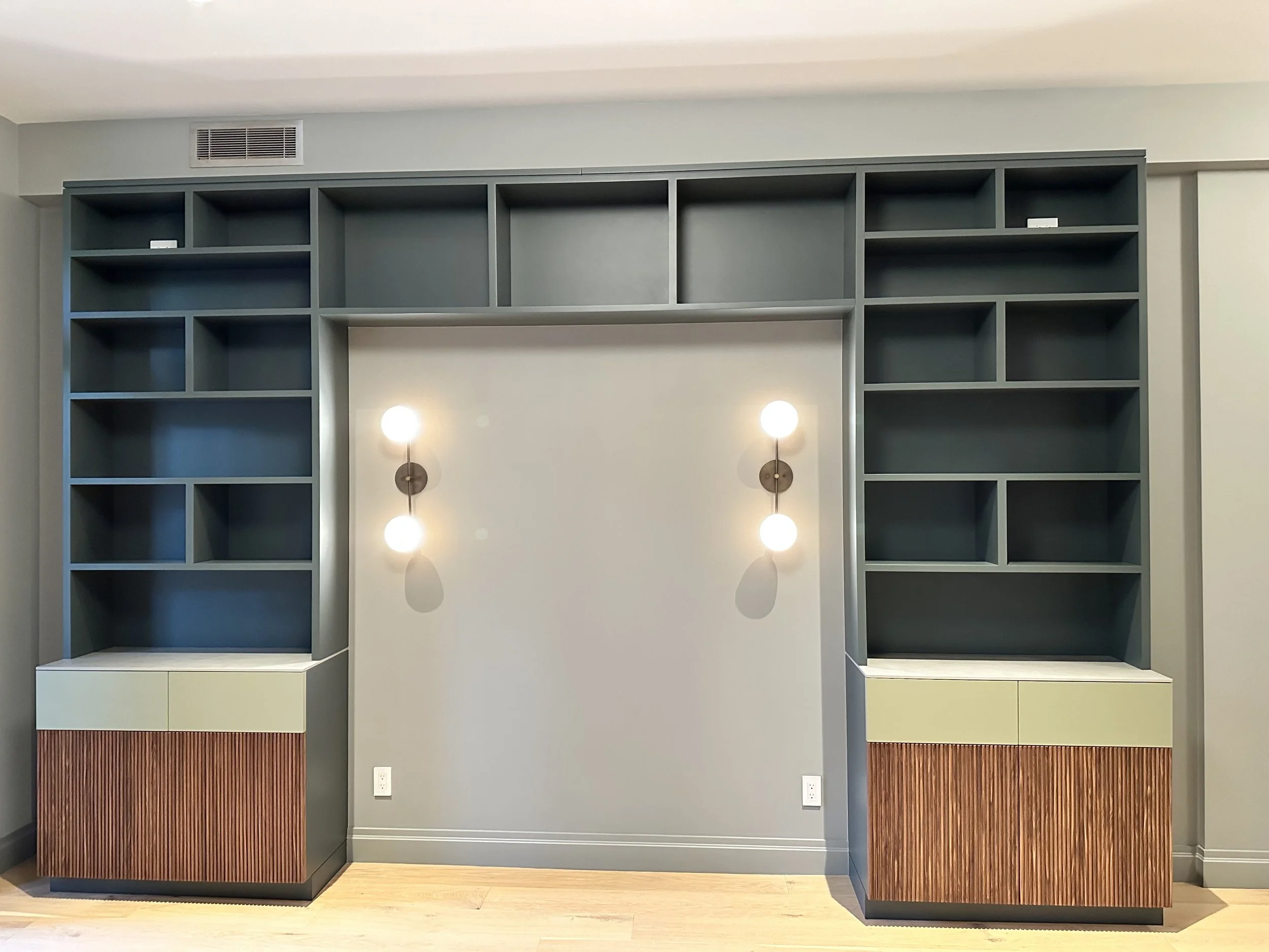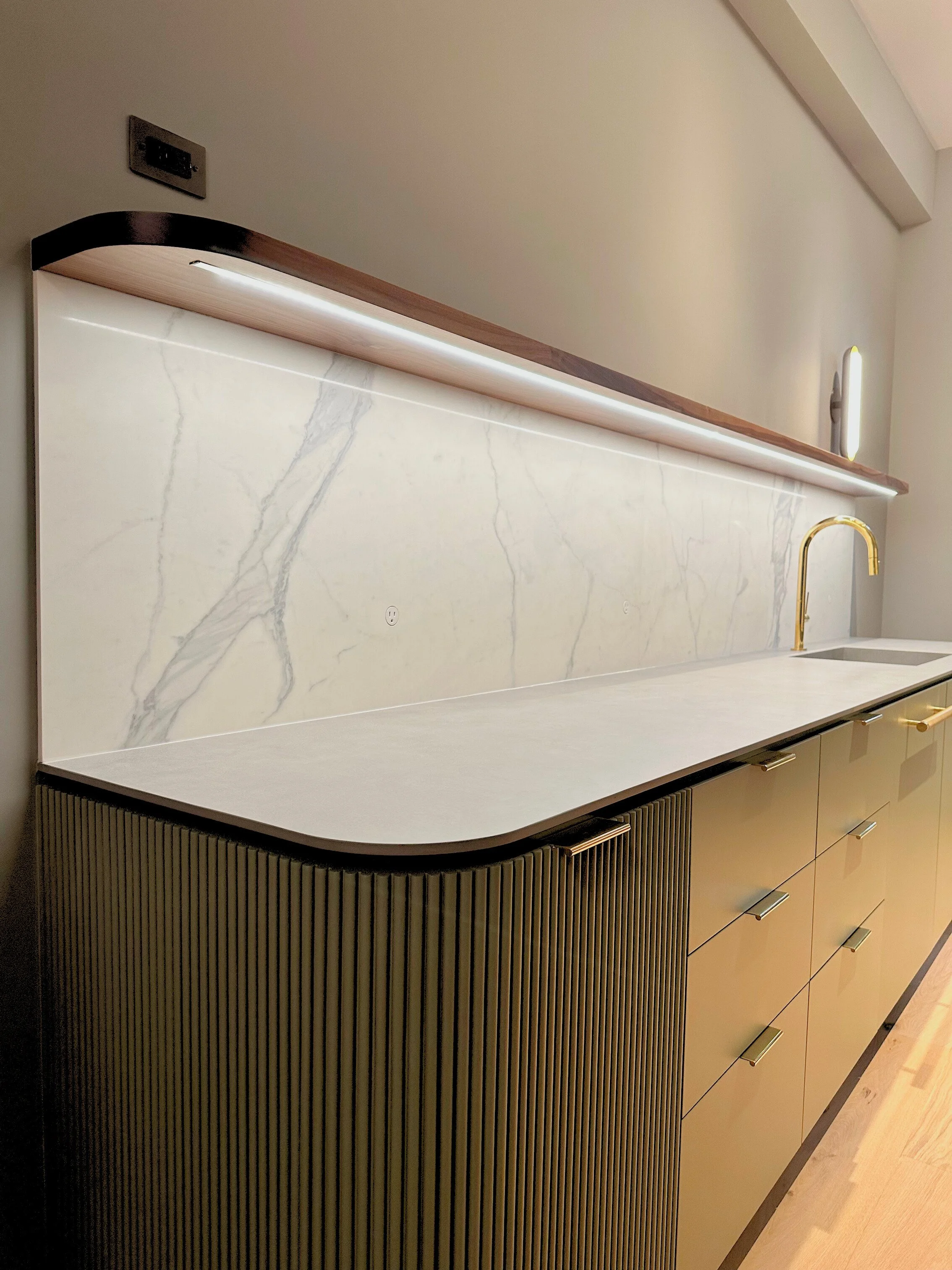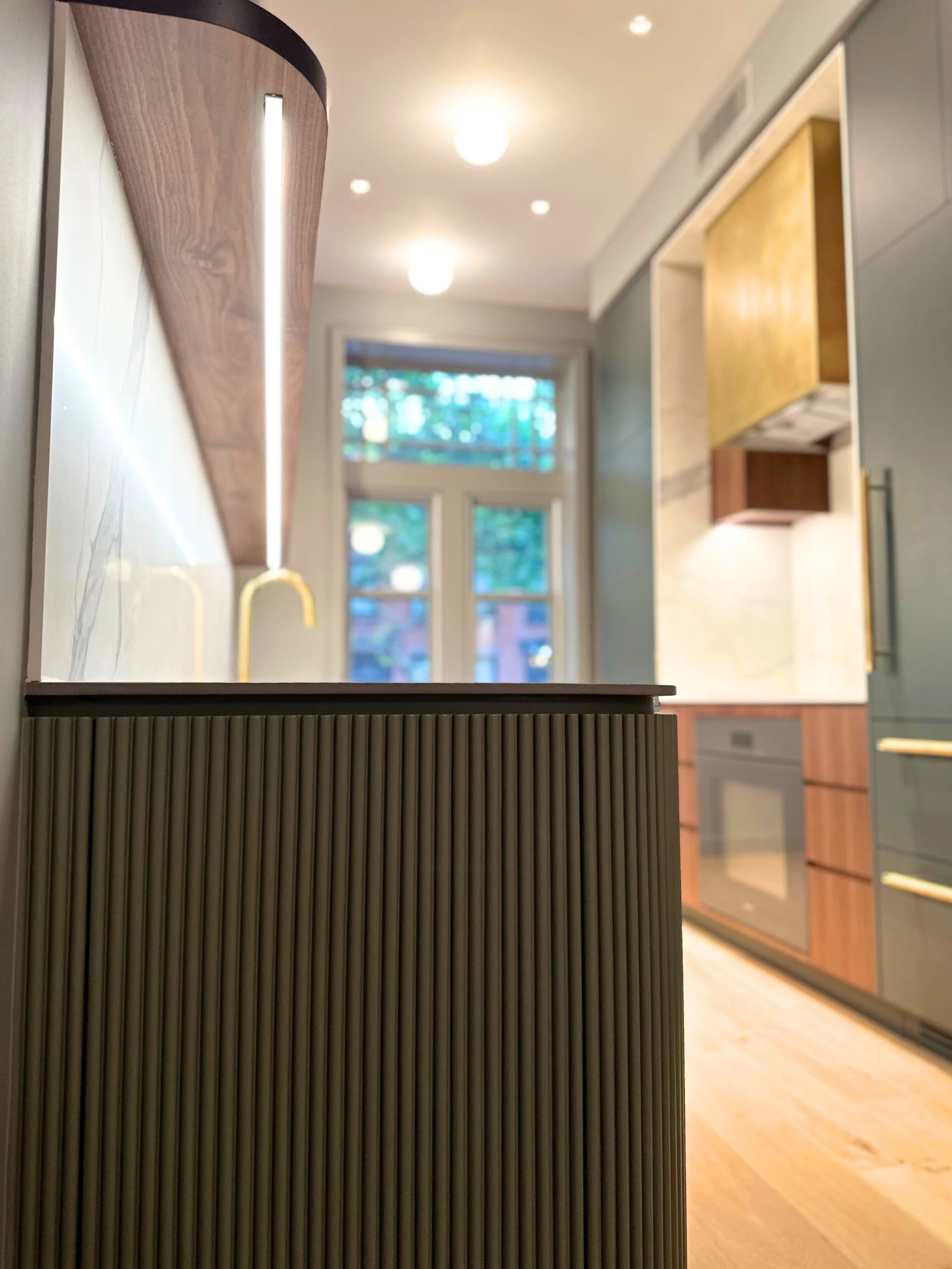 For this townhouse renovation, we wanted to lean into a colorful yet moody feel in the kitchen and adjacent living room cabinetry. Cabinets were designed to read more like furniture - utilizing rounded corners, tamboured fronts, unlacquered brass detailing, rich greens, and matte finishes. The custom storage unit created a niche for a future sofa, art, and a vast book collection.
