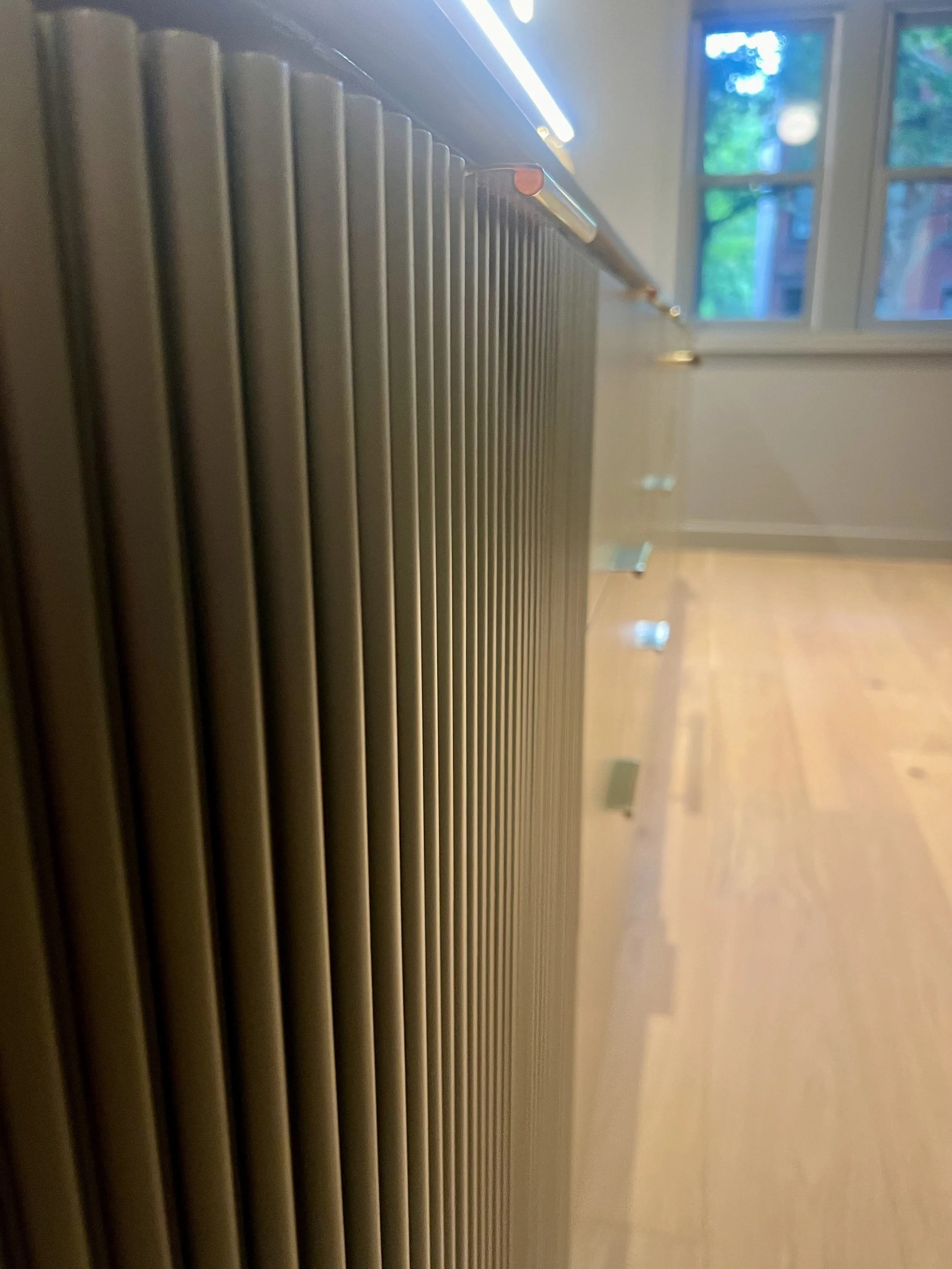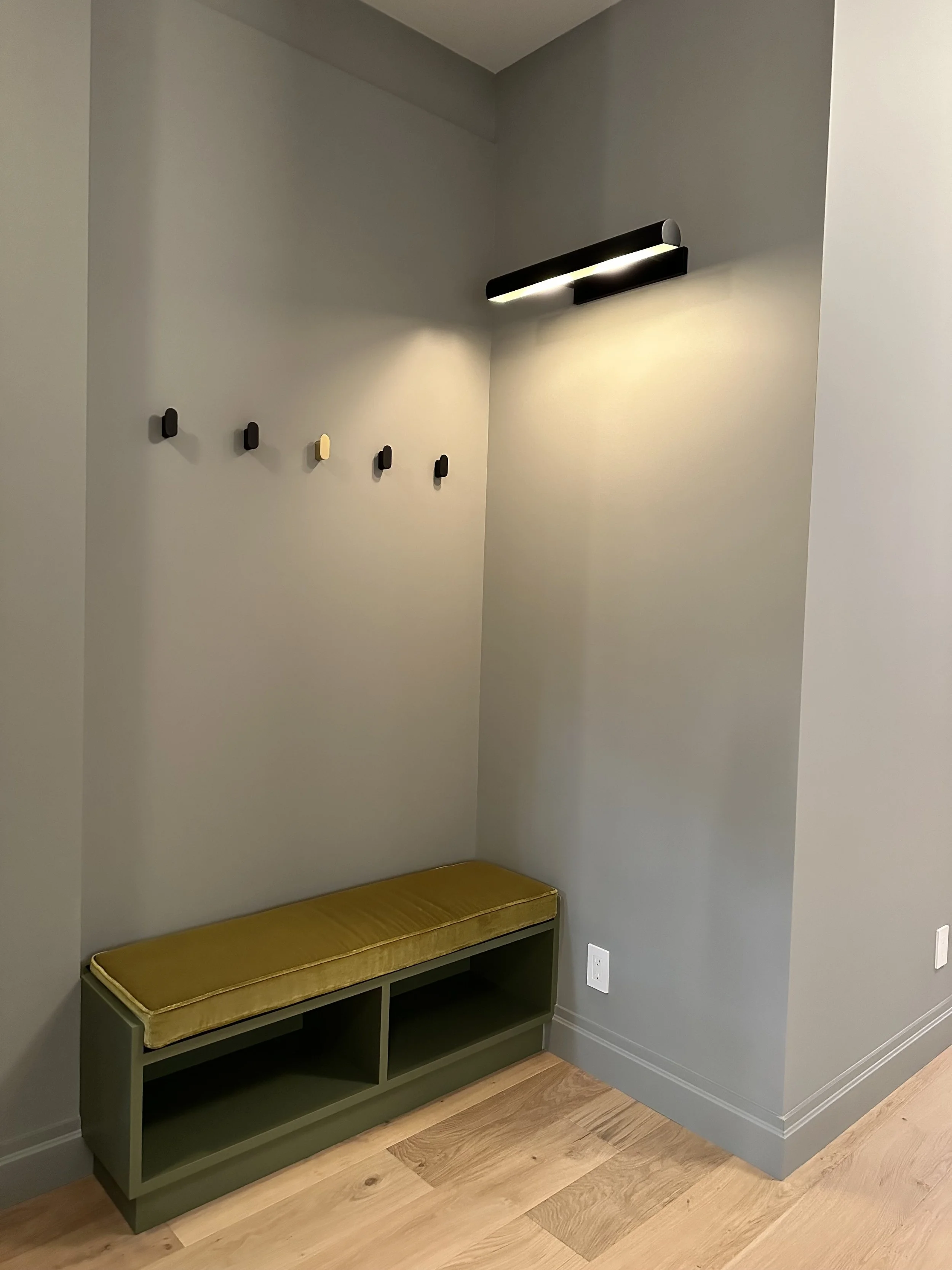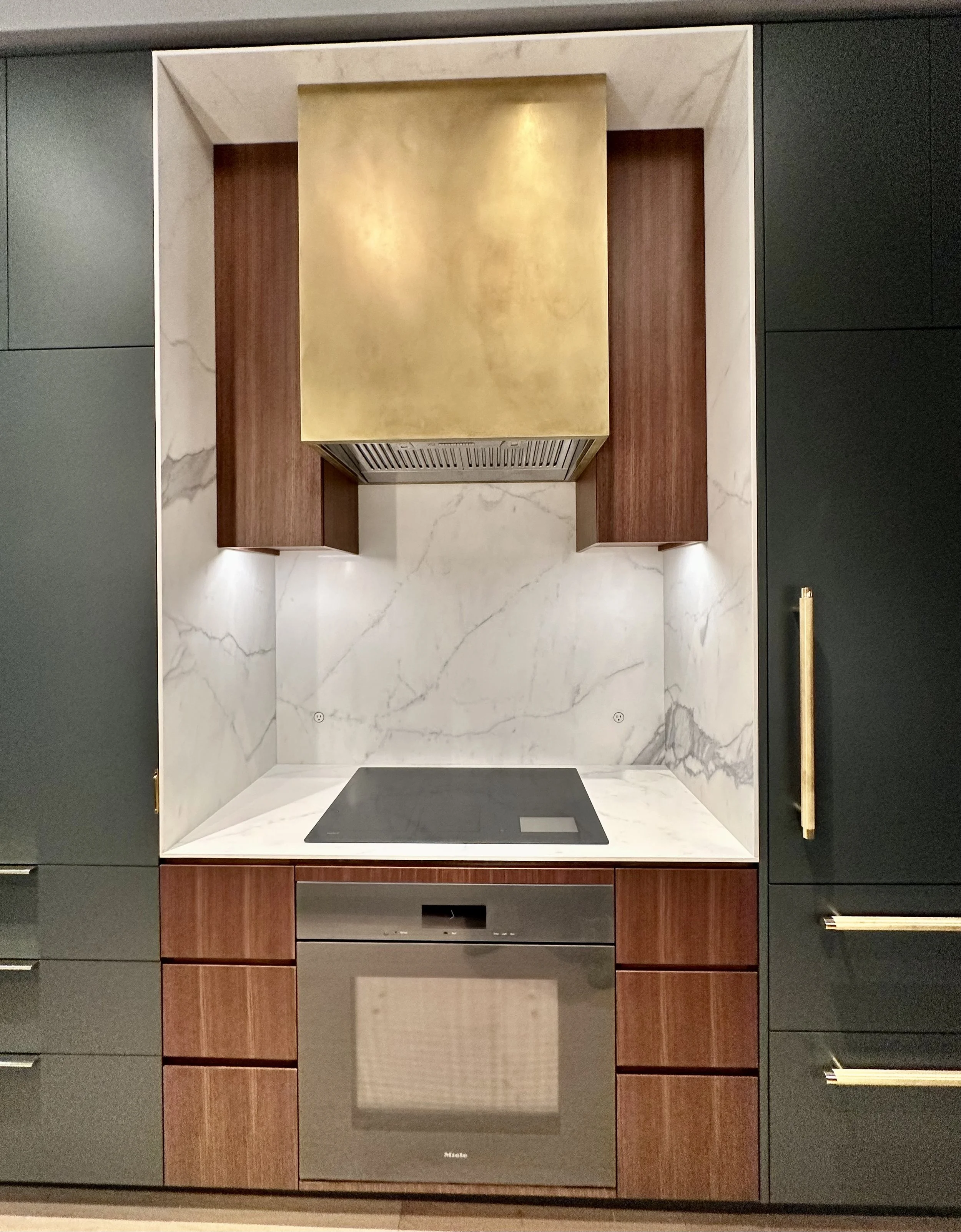 For this townhouse renovation, we wanted to lean into a colorful yet moody feel in the kitchen and adjacent living room cabinetry. Cabinets were designed to read more like furniture - utilizing rounded corners, tamboured fronts, unlacquered brass detailing, rich greens, and matte finishes. The custom storage unit created a niche for a future sofa, art, and a vast book collection.