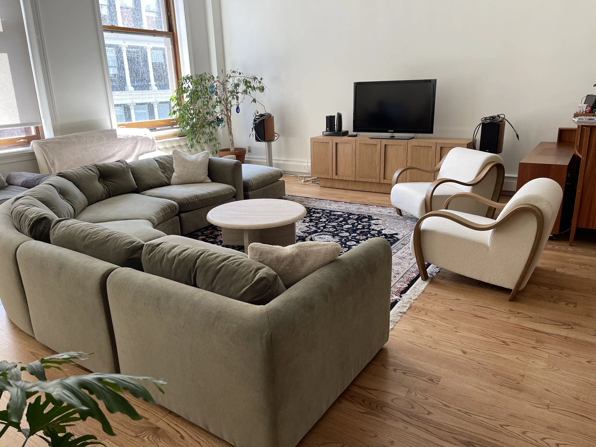 A SoHo loft refresh with a clean, minimal kitchen in European White Oak and creamy composite quartzite. Additional furnishing work to pull together the look in this space with gorgeous natural light and high ceilings.