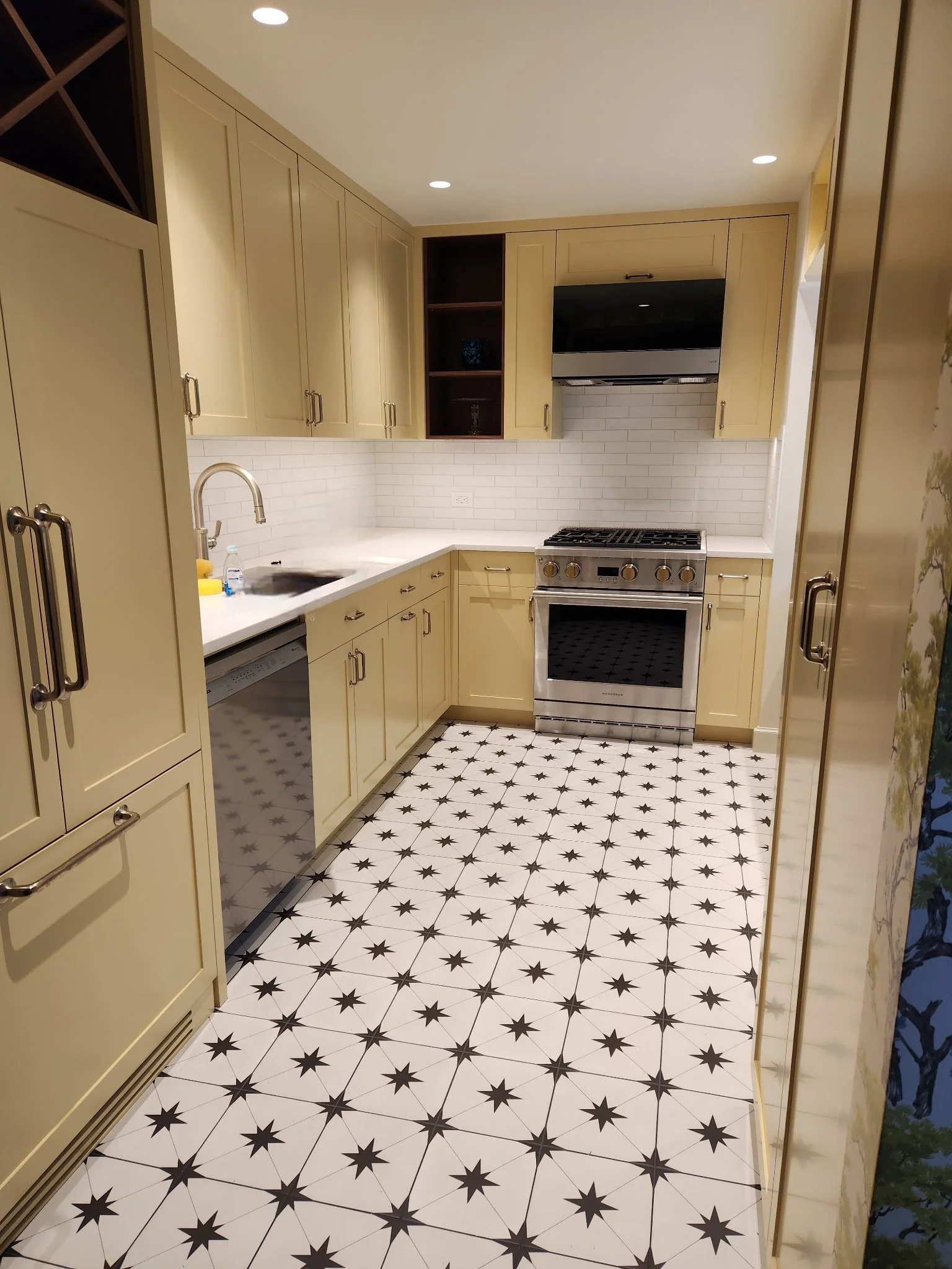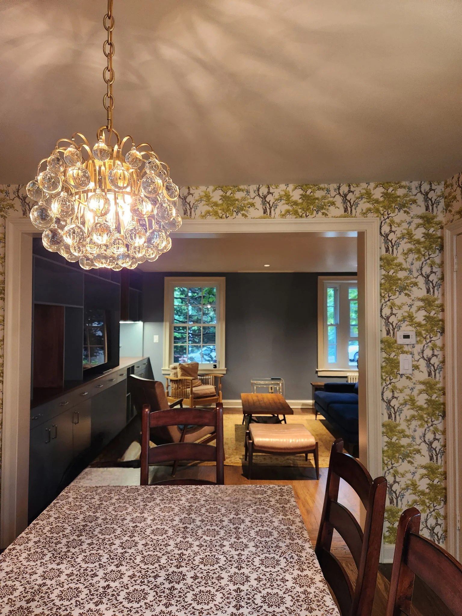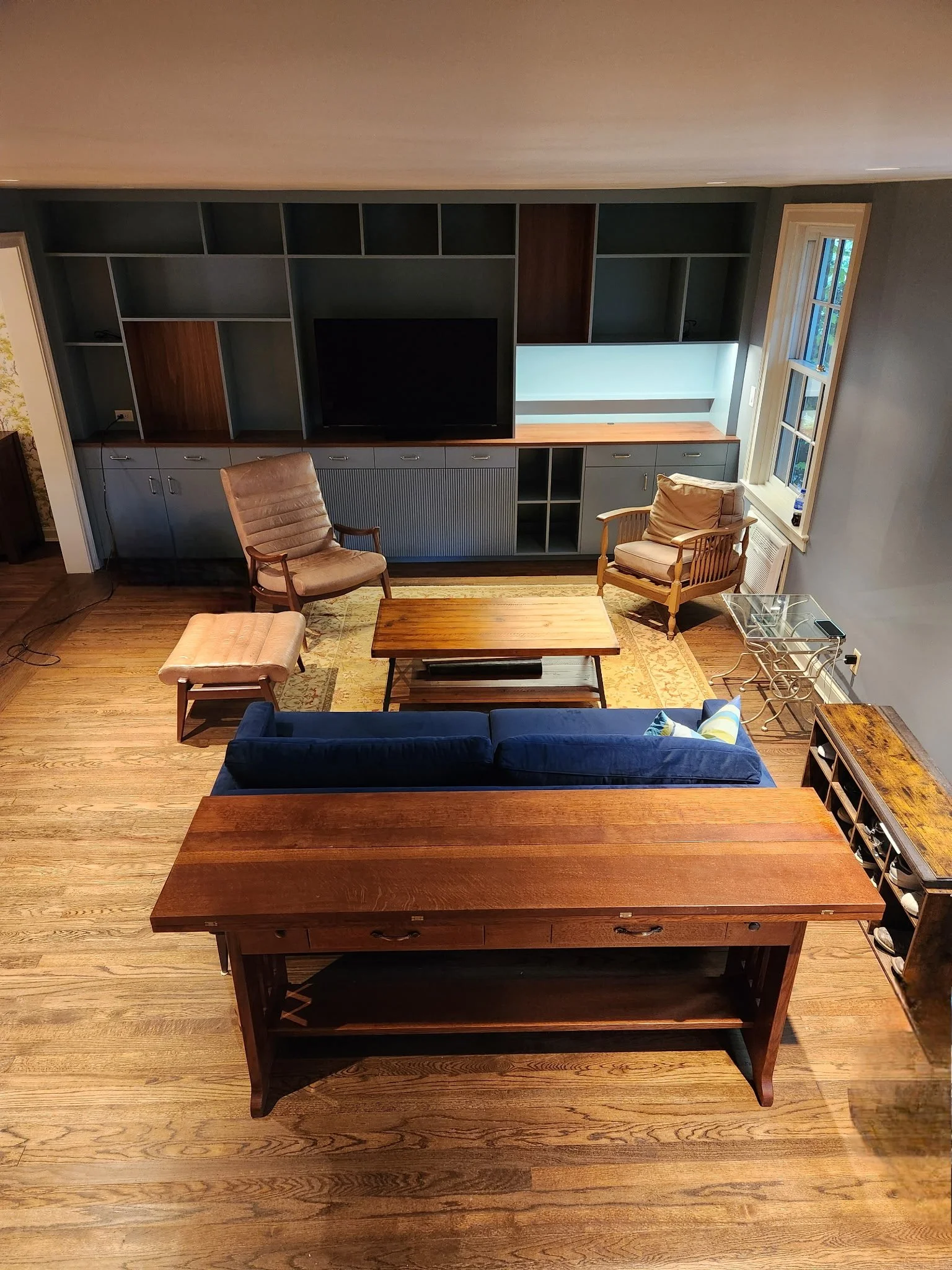 In this Sunnyside kitchen renovation, we wanted to stay in keeping with the historical references of the home but with a modern approach. Cheery colors and bold wallpaper highlighted this happy project. The bookcase unit was designed to fit the entertaining lifestyle of the homeowners - who have a vast vinyl collection and A/V needs as well as some important pieces of art.